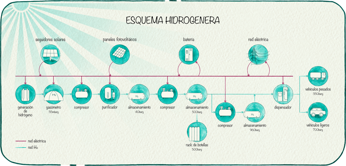 La hidrogenera ha sido dimensionada para producir un promedio de 60 kg/día de hidrógeno verde mediante electrolizadores alimentados por energía solar, que producirán hidrógeno a 350, 500 y 700 bar en función del tipo de vehículo.